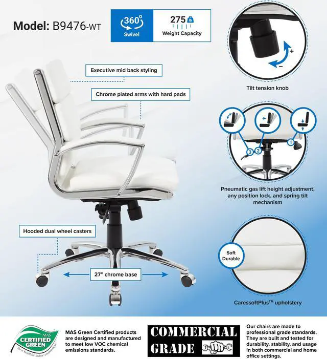 * Product Type: Chair<br /> * Product Type: Chair<br /> * Packaged Quantity: 1 Each<br /> * Limited Warranty: 6 Year<br /> * Features: Heavy Duty<br /> * Features: Tilt Tension<br /> * Features: Pneumatic Adjustment<br /> * Features: Gas Lift<br /> * Features: Upright Locking<br /> * Features: Comfortable<br /> * Features: Spring Tilt Mechanism<br /> * Features: Breathable<br /> * Features: Durable<br /> * Features: Easy Clean<br /> * Features: Sturdy<br /> * Features: Hooded Double Wheel Caster<br /> * Features: Padded Arm<br /> * Product Model: B9476-WT<br /> * Product Name: CaressoftPlus? Executive Mid-Back Chair<br /> * Maximum Load Capacity: 275 lb<br /> * Brand Name: Boss<br /> * Maximum Load Capacity: 275 lb<br /> * Brand Name: Boss<br /> * Frame Color: Chrome<br /> * Country of Origin: China<br /> * Height: 41"<br /> * Width: 27"<br /> * Depth: 27"<br /> * Frame Color: Chrome<br /> * Number of Casters: 5<br /> * Base Material: Chrome<br /> * Seat Material: Vinyl<br /> * Chair/Seat Type: Executive Chair<br /> * Adjustable Seat: Yes<br /> * Adjustable Arm: Yes<br /> * Seat Color: White<br /> * Maximum Seat Height: 23"<br /> * Back Color: White<br /> * Back Height: 19.50"<br /> * Back Width: 18.50"<br /> * Arm Material: Metal<br /> * Arm Material: Chrome<br /> * Arm Height: 30"<br /> * Back Type: Mid<br /> * Armrest: Yes<br /> * Seat Feature: Upholstered<br /> * Seat Feature: Height Adjustment<br /> * Environmentally Friendly: Yes<br /> * Environmental Certification: MAS Certified Green<br /> * Number of Casters: 5<br /> * Base Material: Chrome<br /> * Seat Material: Vinyl<br /> * Seat Width: 19"<br /> * Seat Depth: 20"<br /> * Chair/Seat Type: Executive Chair<br /> * Adjustable Seat: Yes<br /> * Adjustable Arm: Yes<br /> * Seat Color: White<br /> * Minimum Seat Height: 20"<br /> * Maximum Seat Height: 23"<br /> * Back Material: Vinyl<br /> * Back Color: White<br /> * Back Height: 19.50"<br /> * Back Width: 18.50"<br /> * Arm Material: Metal<br /> * Arm Material: Chrome<br /> * Arm Height: 30"<br /> * Base Shape: 5-star<br /> * Back Type: Mid&l
