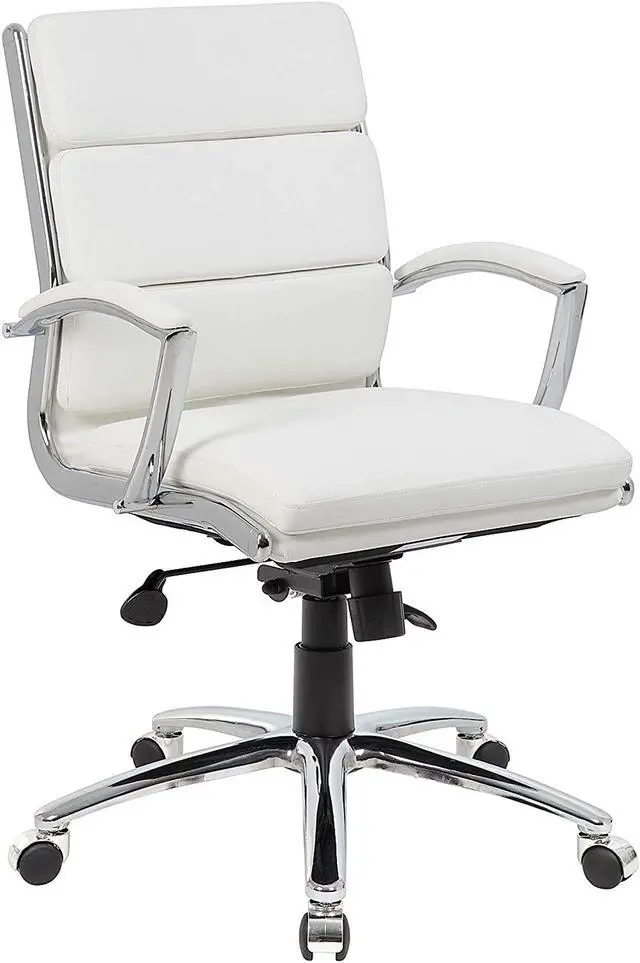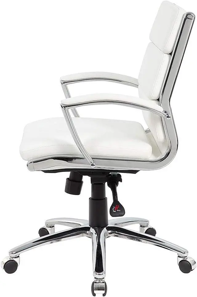 The mid-back executive CaressoftPlus chair in white with the metal chrome finish is as comfortable as it is handsome. The chair utilizes a two paddle mechanism which designates one paddle for lift and one paddle to release spring tilt or lock; it is very heavy duty. The chair is made with a material called CaressoftPlus which is a trademarked vinyl that is an ultra-soft, breathable upholstery that looks & feels like leather, but more durable & easy to clean. The chair also offers tilt tension, a pneumatic gas lift and an upright lock. It has been designed with a sturdy 27 inch chrome base with 2 inch nylon dual castor wheels and has a weight capacity of 275 lbs.