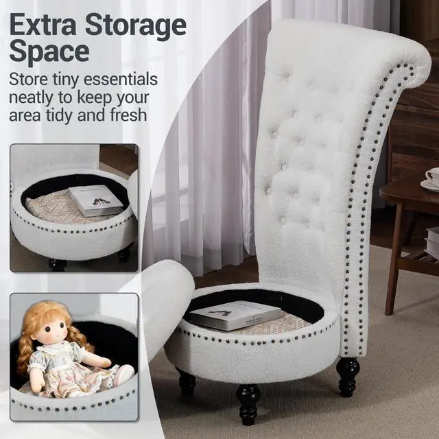 A handy hidden storage compartment under the seat (approx. 16.9 x 16.9 x 4.3 inches) keeps blankets, books, or electronics tidy, adding functionality like a vanity chair with storage.