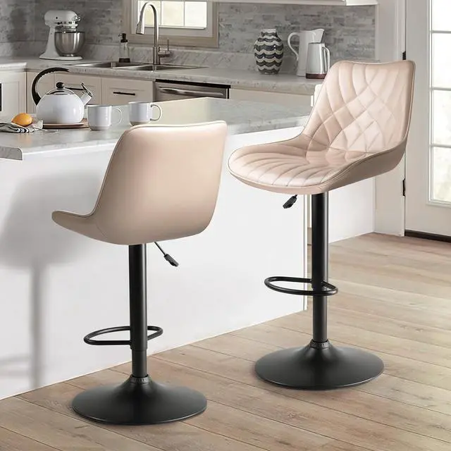 ADJUSTABLE HEIGHT & 360 SWIVELThe barstool can be steplessly and smoothly adjusted in height from 25.4 '' to 33.2 '', by simply lifting the lever under the seat with ease. The 360-degree swivel seat of the kitchen stool allows you to chat with your friends more freely.