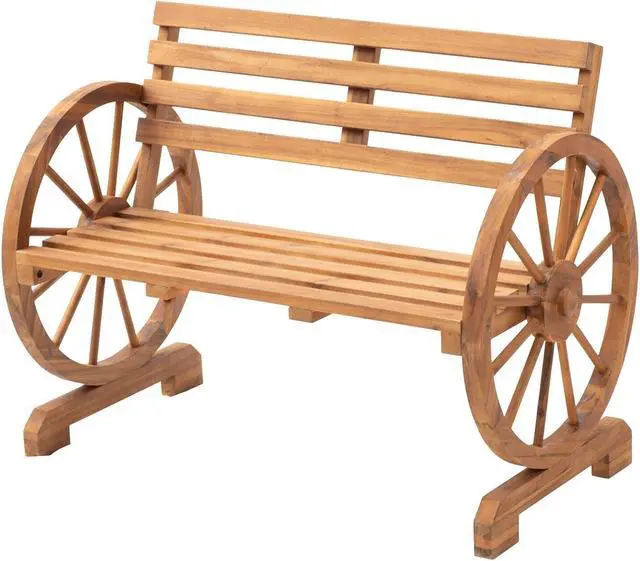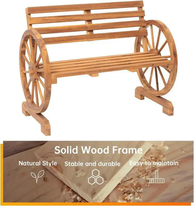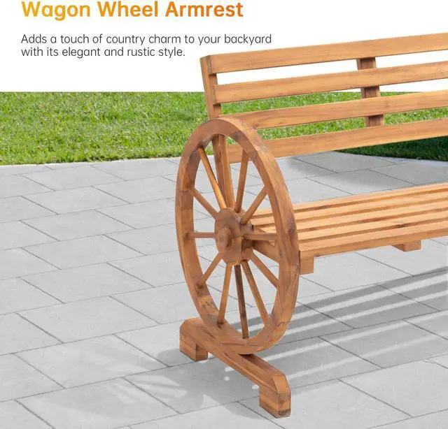 WAGON WHEEL ARMRESTS: The arm rests of this outdoor garden bench are designed with interesting carriage wheels, which will certainly become the focus of attention. Our benches will add rural beauty and charm to your courtyard, porch, garden or other outdoor areas. The warm natural finish highlights the natural wood and protects it from the weather.