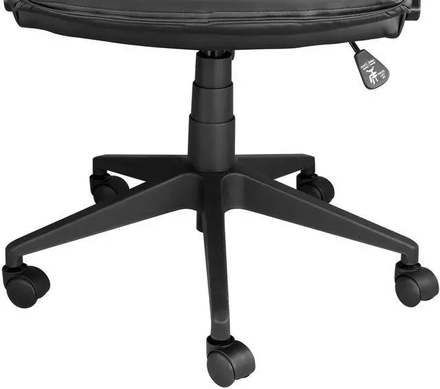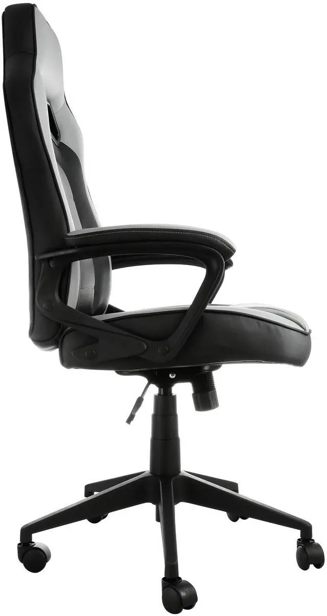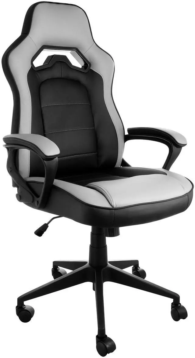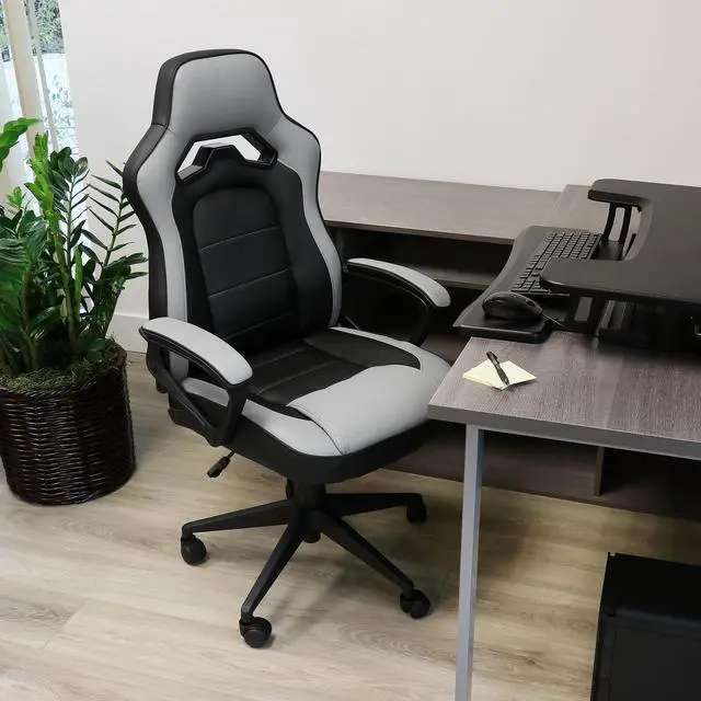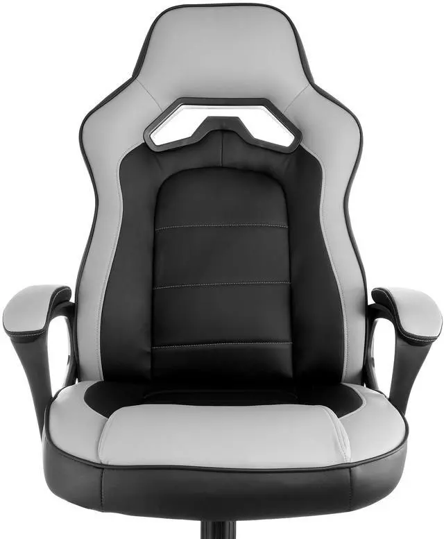 Work comfortably at home or at the office with the Elama High Back Adjustable Faux Leather Office Chair in Gray and Black. This chair is designed with both luxury and efficiency in mind. Constructed with an ergonomic and comfortable sturdy faux leather seat with padded arm rests, 360 Degree swivel, and an opening at the upper back for ventilation. Features a five wheel bottom design and adjustable height for customization. Move freely around your workspace while getting the support you need with this office chair by Elama!