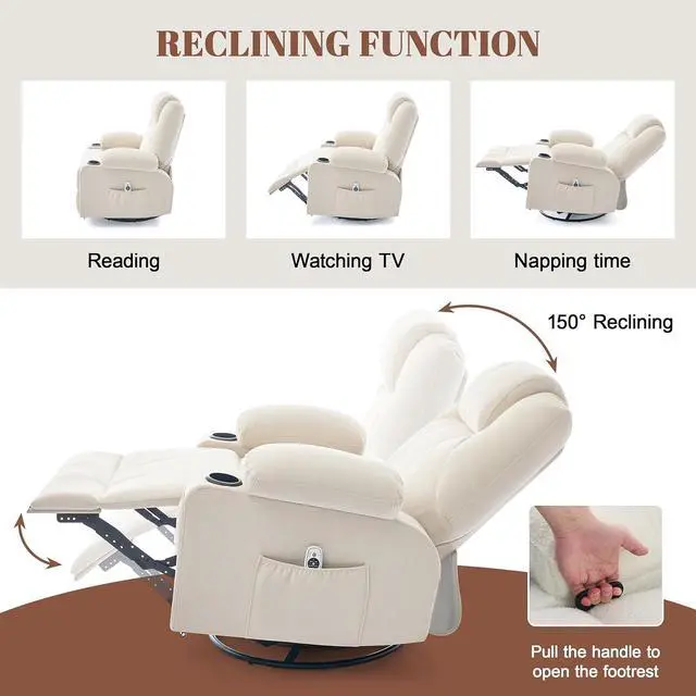[ROCKING & RECLINING] You can extend the footrest using a side pull buckle and recline the swivel rocker recliner chairs using your body weight (up to 150 degrees). It features a 360-degree swivel function, allowing you to freely choose the direction you want to face. It also offers a 30-degree rocking function which you can rock back and forth while watching TV or reading magazines. When closing the footrest, you may encounter some resistance, so you need to close it quickly and with force