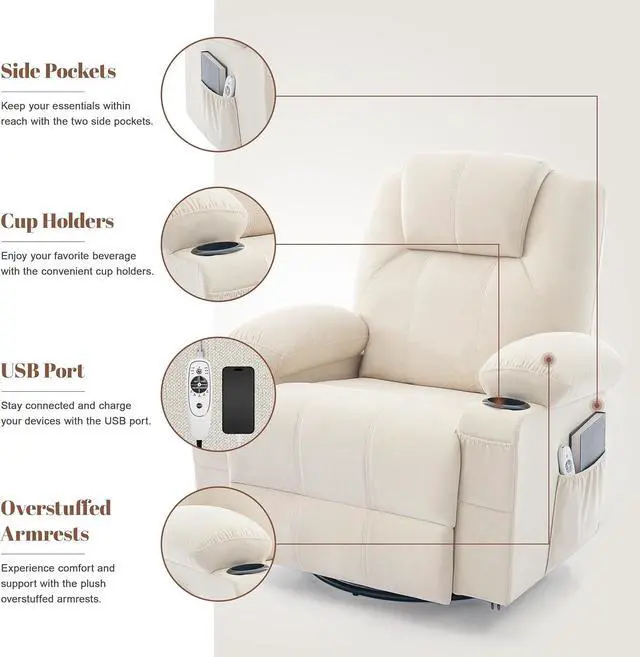 Oversized Swivel Rocker Recliner Chair with Heat and Massage, 360 Degree Swivel Rocking Single Sofa with USB Port and Cup Holders, Large Big Recliner Chair for Living Room Light Beige
