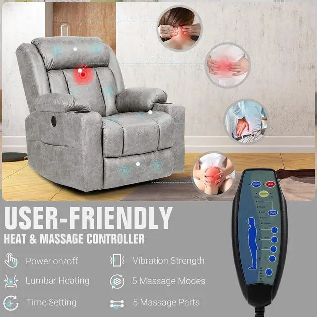 Retro Rocking Recliner Chair, Massage Rocker Recliner Chair with Vibration Massage and Heat, USB and Type-C Ports,360° Swivel Chairs, Living Room, Bedroom, Nursery, RV, Light