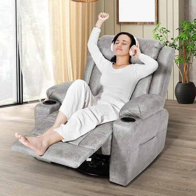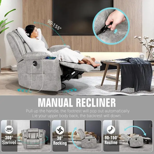 Swivel Rocker Recliner Chairs:Swivel recliner chairs for adults have 360° Swivel, 30° Rocking, and 90-150° angle reclining function for versatile use. Easily adjust the small rocker recliner chair by pulling out the lever located next to the armrest to activate the footrest. Note that the swivel recliner chair backrest smoothly retracts as you change positions.The swivel function adds an element of fun and entertainment and it fits into tight spaces for a comfortable experience.