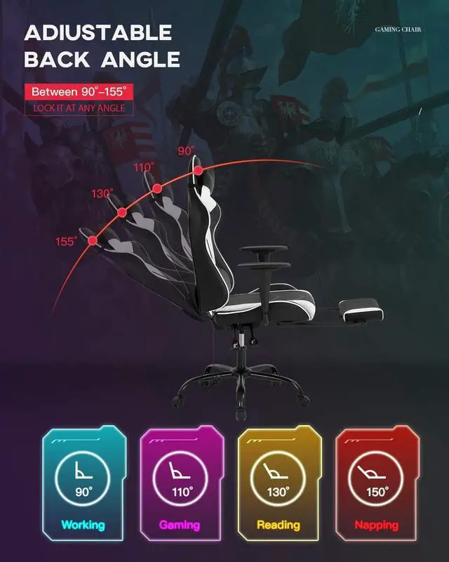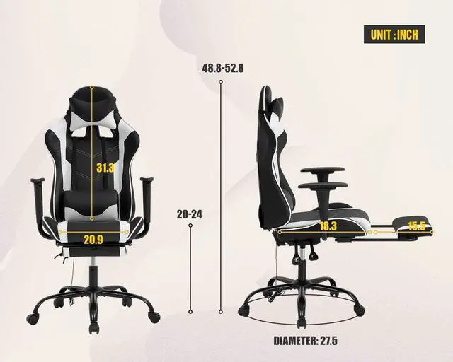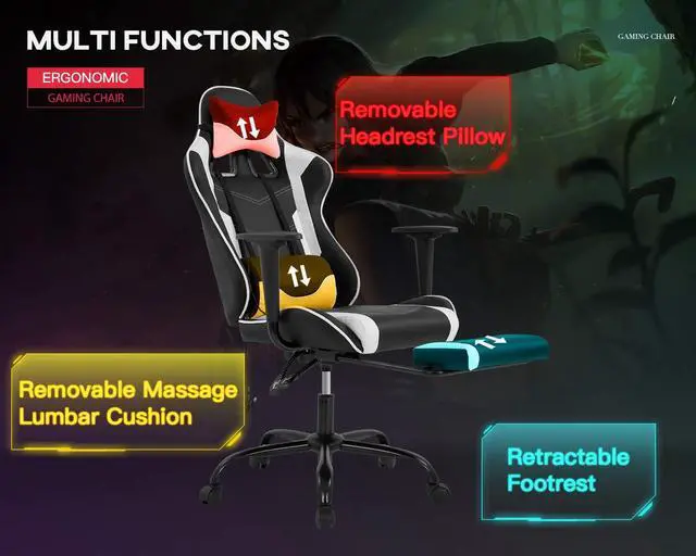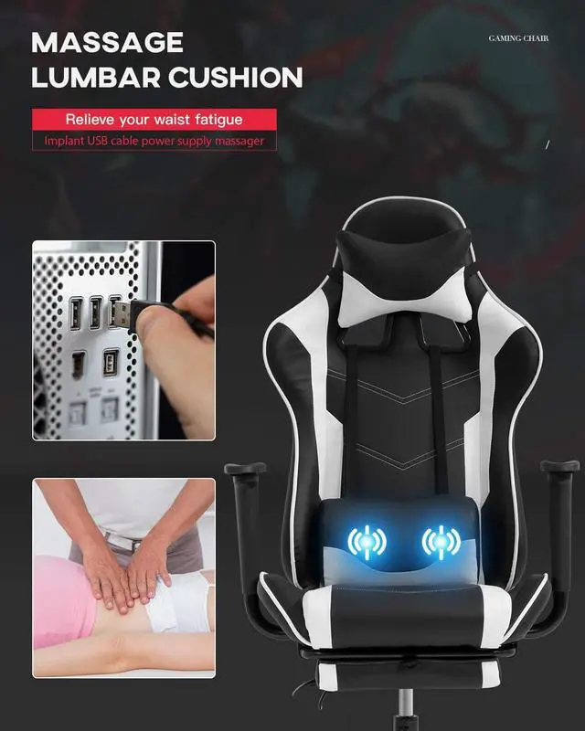 Ergonomic&Massager: Our office chair designed with ergonomic construction. Our gaming chair have removable headrest pillow and lumbar Cushion offer your neck and waist Full support when you rest on it. they also comes with an extendable footrest. it also features a variety of reclining locking positions. Lumbar cushion contains a vibrator with remote control, slight vibration can reduce the fatigue caused by your long hours of work. Gaming chair office chair computer chair executive chair.