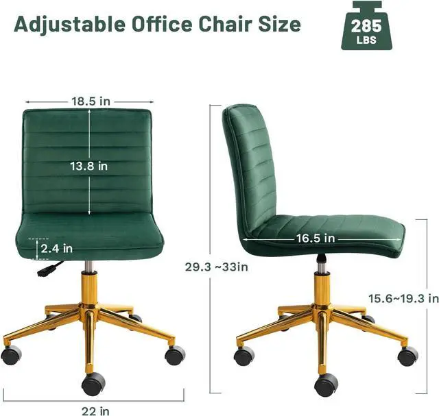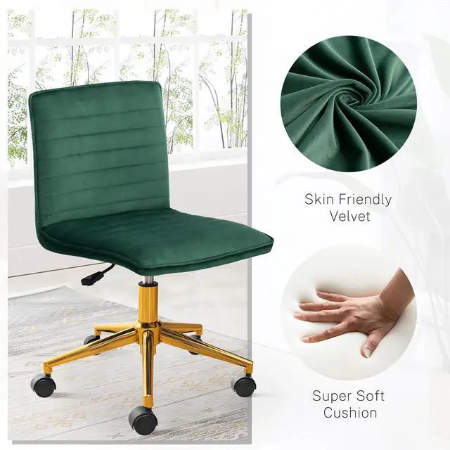 Furniliving Armless Vanity Chair with Wheels, Computer Rolling Desk Chair with Back Soft Velvet Fabic Height Adjustable Gold Metal Base Swivel Stool Chairs,DarkGreen