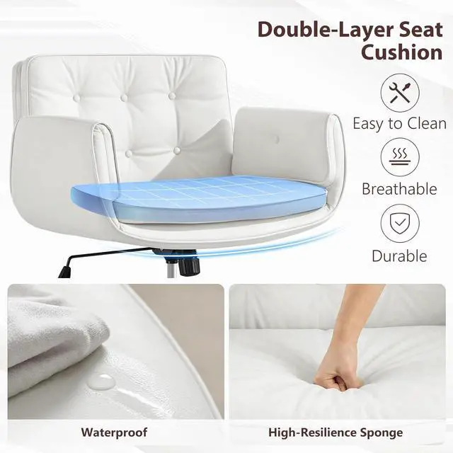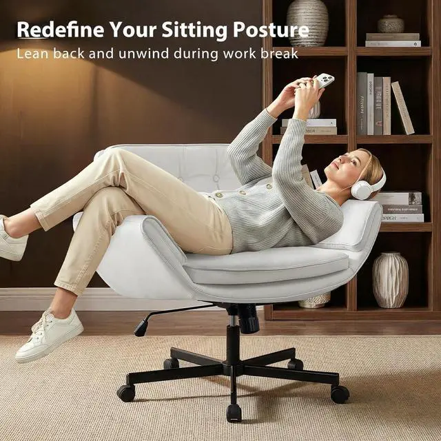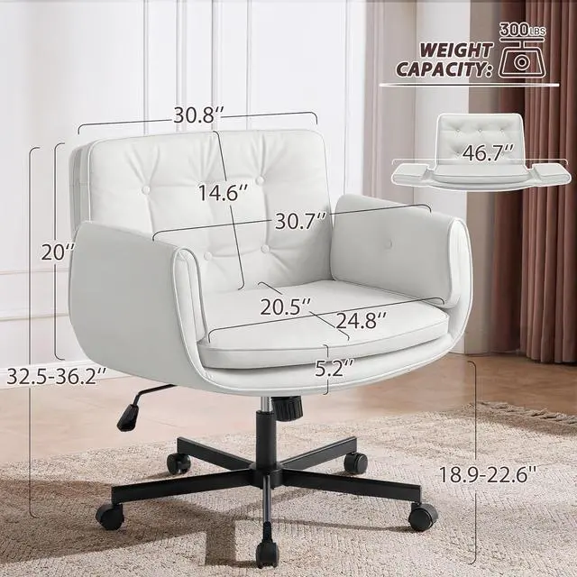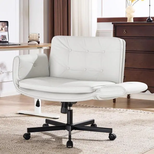 Furniliving Criss Cross Chair with 5-Position Adjustable Arms, Pet-Friendly PU Leather Swivel Vanity Chair with Wheels, Comfortable Extra Wide Computer Desk Chair for Home Office, Bedroom, White
