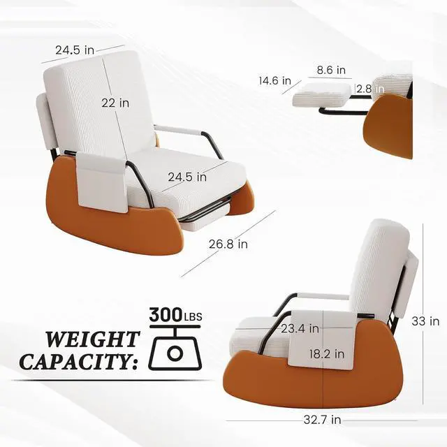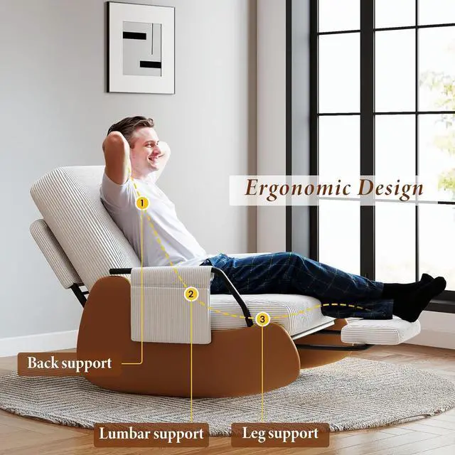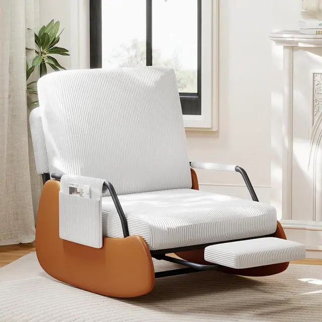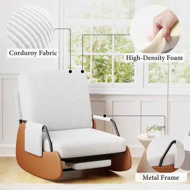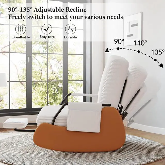 DURABLE & SAFE: This rocking chair adopts an ergonomic design, while balancing the comfort and safety of the rocking chair. The chair legs are designed with high-quality PU leather wrapping to prevent tripping in daily life. The bottom is equipped with wear-resistant anti-slip pads and anti-tippled ove buttons, allowing you to freely enjoy 90 ° -135 ° relaxation on the rocking chair.