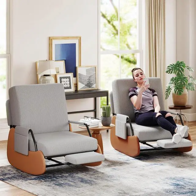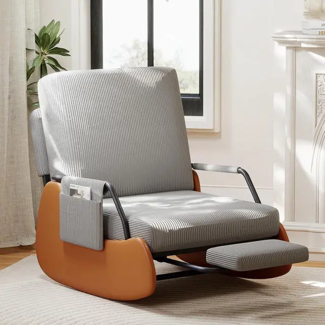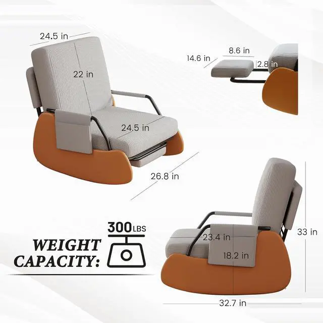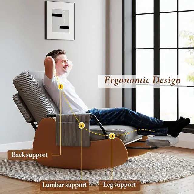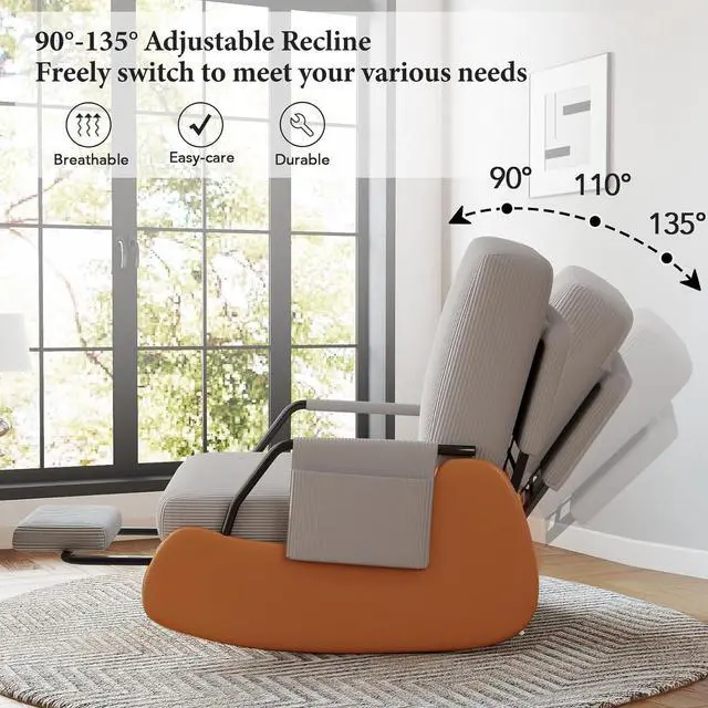 DURABLE & SAFE: This rocking chair adopts an ergonomic design, while balancing the comfort and safety of the rocking chair. The chair legs are designed with high-quality PU leather wrapping to prevent tripping in daily life. The bottom is equipped with wear-resistant anti-slip pads and anti-tippled ove buttons, allowing you to freely enjoy 90 ° -135 ° relaxation on the rocking chair.