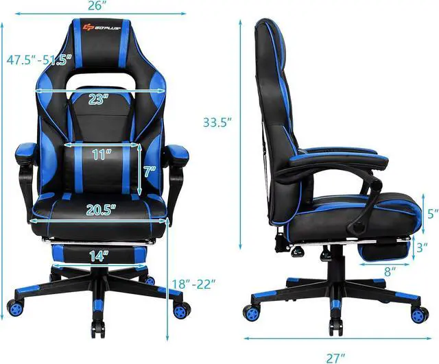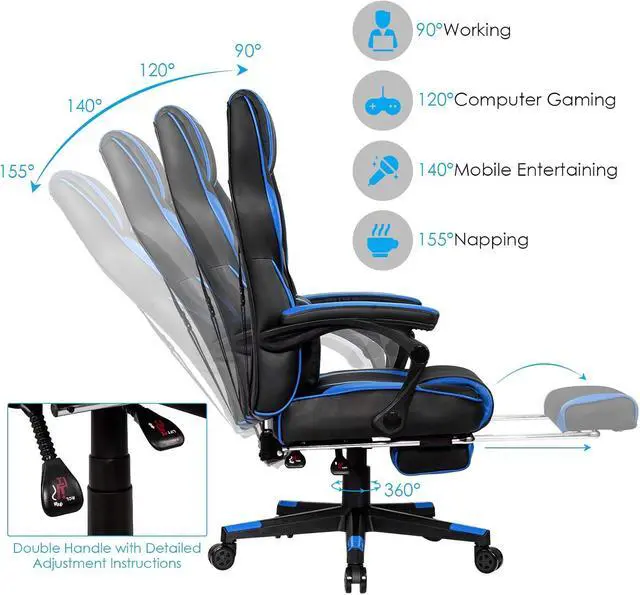 Ergonomic Design The gaming chair adopts ergonomic design, with headrest and lumbar pillow. There is an adjustable backrest with an adjustable range of 90°-180°. Find a suitable angle for you to lie down and relax when you are tired. The adjustable seat height range is: 18"-22". Adjustable armrest range: 11"-14". The cushion area is very spacious and will not feel crowded. Support 360° swivel, so you can communicate with your teammates in all directions without standing up.
