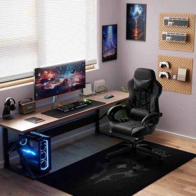 POWERSTONE Gaming Chair Video Game Chair with Footrest and Lumbar Support Racing Style PU Leather Computer Chair Ergonomic Adjustable Swivel Task Chair Black