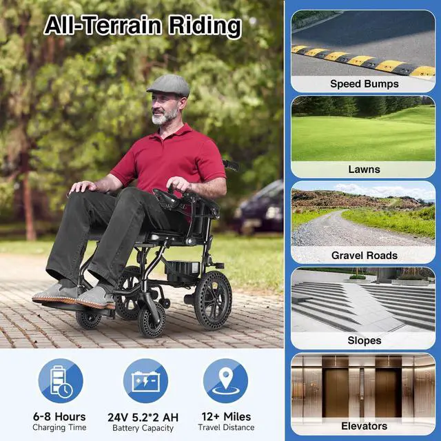Battery Life: Equipped with two 5.2AH lithium batteries, it eliminates the hassle of frequent charging, offering a range of up to 12 miles on a full charge. The Zurcheel motorized wheelchair is also airline-certified for cruising.