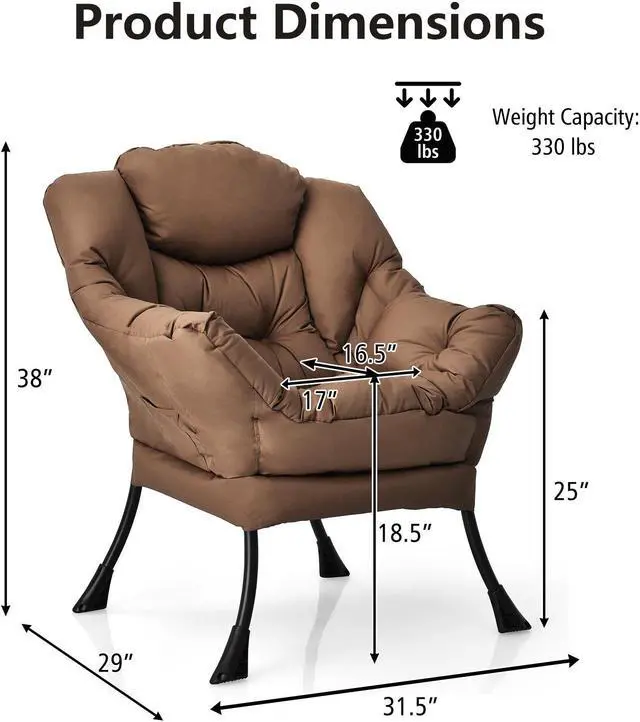 Easy to Assemble: Following the detailed and illustrated manual guidance, you can quickly enjoy the seating! All the parts are prepared and labelled with numbers to help with a fast installation. Chair dimension: 31.5" x 29" x 38" (L x W x H), seat height: 18.5", armrest height: 25".