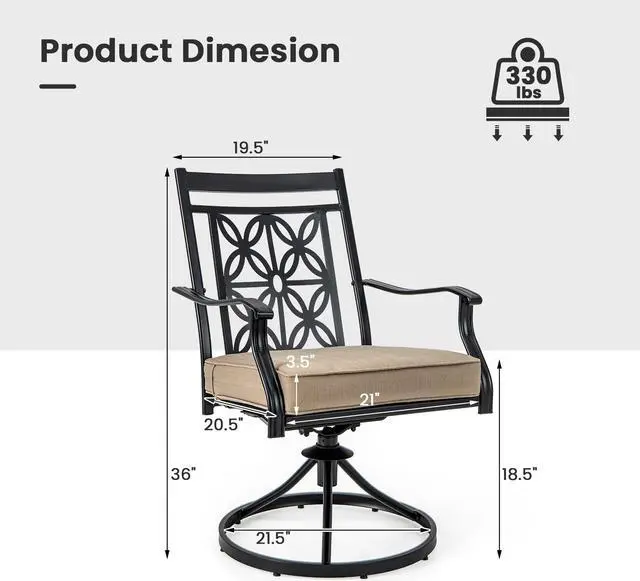 360 Degree Swivel Chair: This patio dining chair comes with a premium swivel mechanism that allows you to effortlessly adjust in any direction without moving the chair. Besides, It comes with a sturdy metal frame to support a weight capacity of 330 lbs.