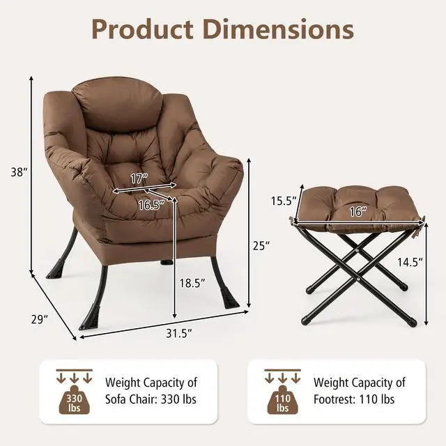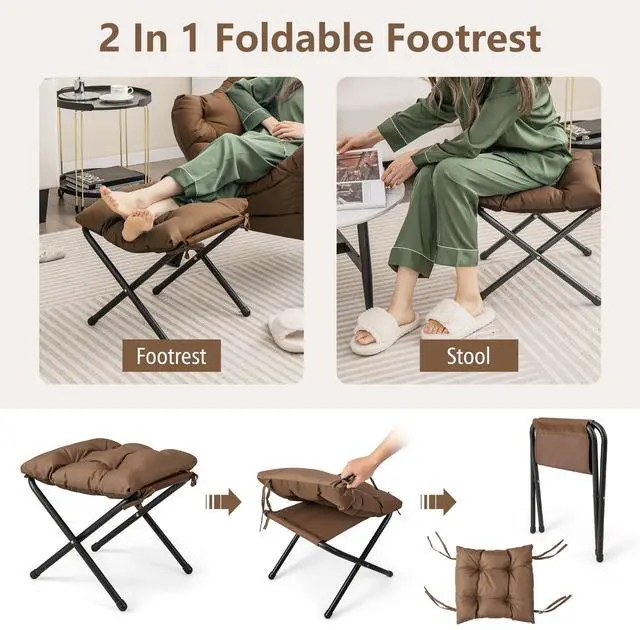 2 In 1 Foldable Footrest: The comfy accent chair comes with a footrest, on which you can rest your legs for relaxation. What's more, the footrest also doubles up as an extra stool, offering additional seating as needed. When not using it, you can quickly fold it up for easy storage.
