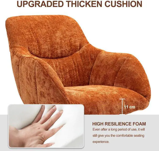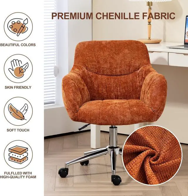 This home office chair is a remarkable blend of plush comfort and contemporary style. The chenille fabric, with its irresistibly soft texture, creates a warm and inviting feel that strikingly contrasts against the lustrous sheen of the polished steel. This combination not only elevates the aesthetic appeal but also ensures durability. Functionally, it's an absolute delight. The adjustable height mechanism provides seamless customization to suit any task, be it intense work sessions or laid-back relaxation. The 360-degree swivel base with wheels enables smooth and effortless rotation, allowing you to reach for items or interact with your surroundings without any strain. Whether you're setting up an office, creating a cozy study corner, furnishing a living room, bedroom, dining area, dressing room, or vanity space, this chair is the epitome of style and functionality, making it an essential addition that will enhance any interior.