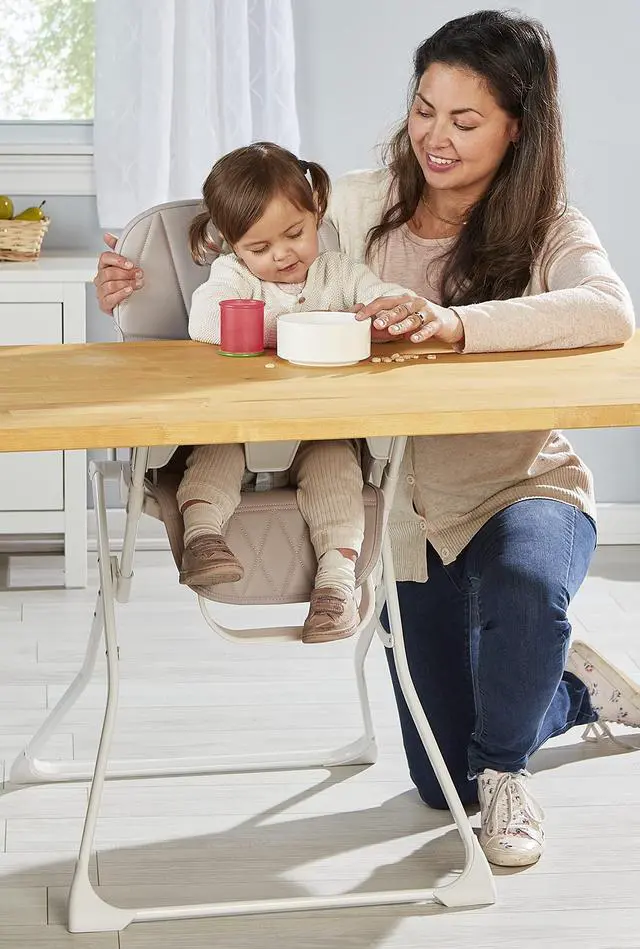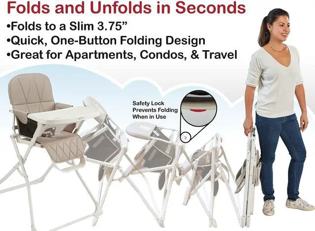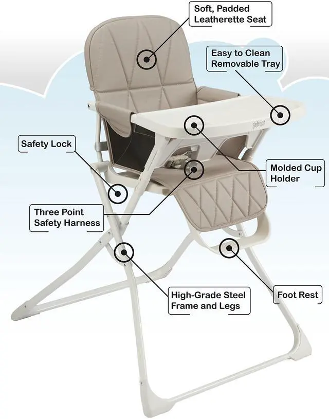 Modern and minimalist, the popup folding high chair by is a high chair that looks great in any kitchen and stows anywhere easily. Folding down to a slim 4" Thick, the popup folding high chair can be stored around the home in closets, pantries, or beside the refrigerator. The lightweight construction makes it easy to travel with and is perfect for mealtime away from home. The popup folding high chair's slim profile and clean look are a direct contrast to the bulky, bulging shapes seen in other high chairs. This high chair will look great in your kitchen or anywhere The family has mealtime. The leatherette seat is soft and Comforting while giving the chair a sophisticated yet minimalist look. Remove the stress from mealtime with the popup's easy setup. Just like unfolding a beach chair, The popup unfolds into a full high chair in seconds. Plus, there's no assembly required and comes out of the box ready for use.