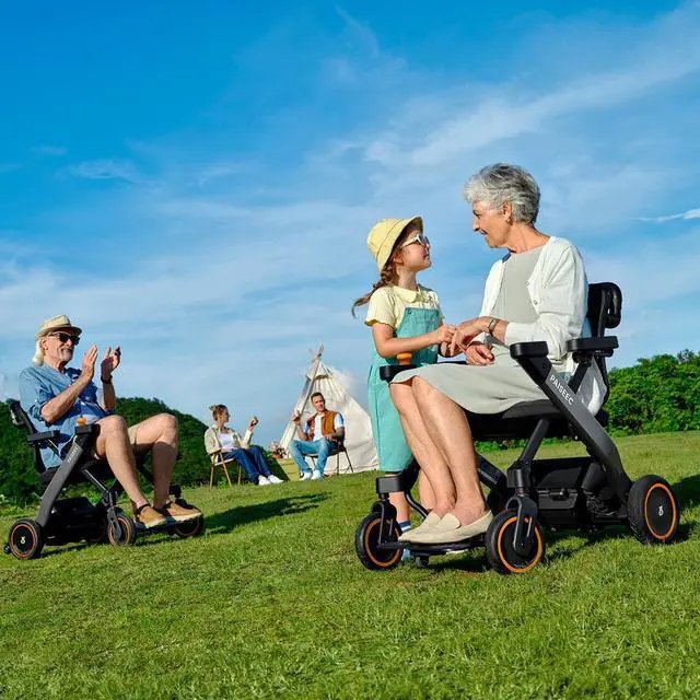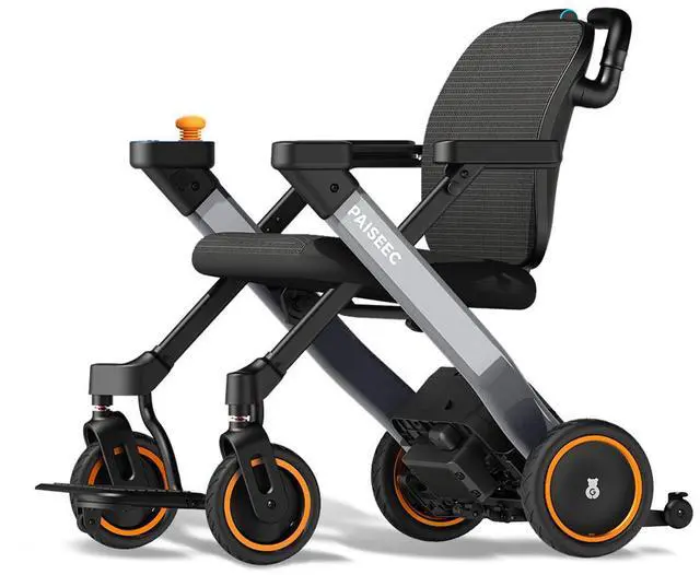 PAISEEC 3 in 1 Mobility Device combines electric wheelchair, smart walker and e push assist functions in one unit. 360W brushless motor, 9 inch air tires, climb 1.6 inch curbs, folds in 2 seconds, airline approved, supports 300 pounds. Power assist handles reduce caregiver strain, walker mode adjusts speed to user gait, anti tip auto brake voice safety features.