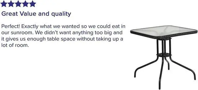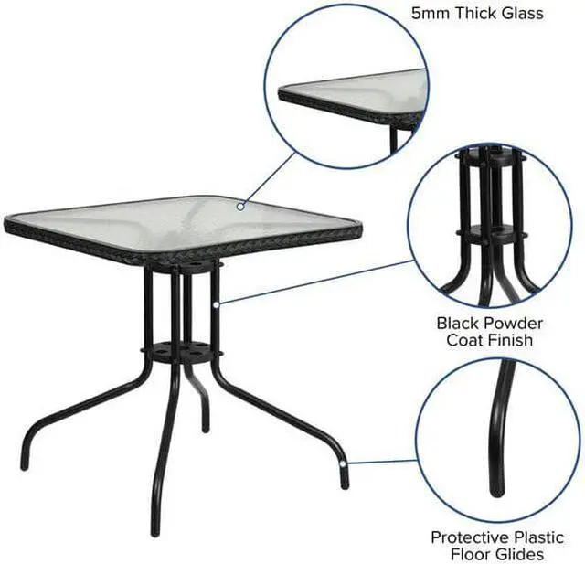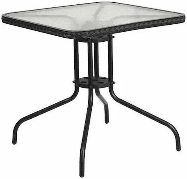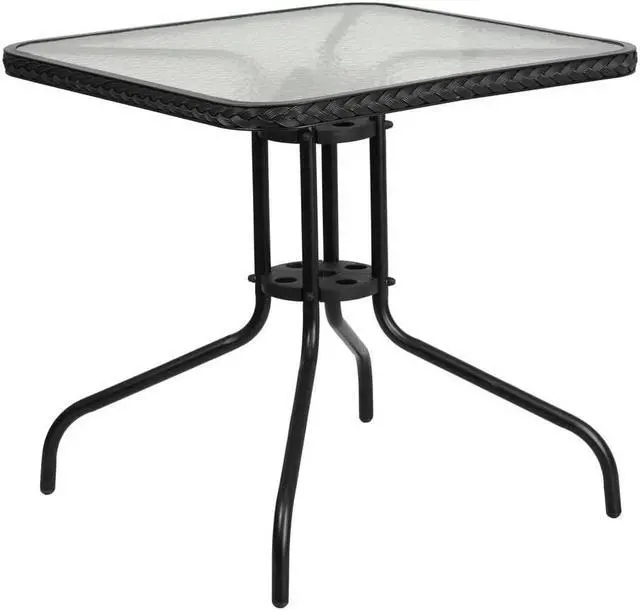 Whether you're adding some much needed real estate to hold drinks and snacks on the patio at home or a place for patrons to relax, have a meal and great conversation, this tempered glass and metal table can help create the perfect relaxing or entertainment environment. The ripple designed table top features a smooth surface for keeping items level and boasts a designer rattan edge band that blends seamlessly with the black powder coat finish. The table was designed for all-weather use making it a great option for indoor and outdoor settings. For longevity, care should be taken to protect from long periods of wet weather. Couple this table with your favorite chairs and go for a monochromatic look or add a pop of color. No matter how you use it, this glass table will enhance the look of your bistro, cafe, restaurant, hotel or home patio space.