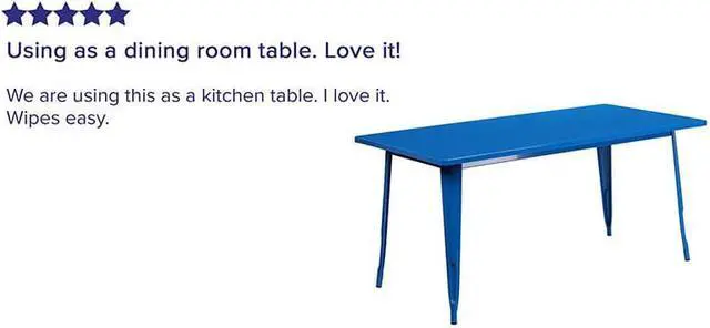 This rectangular, indoor-outdoor metal cafe-style table will add a pop of color and a touch of industrial chic to your business or your dining room at home. Measuring 31.5 inches wide by 63 inches long, this table will comfortably accommodate six chairs and features a smooth top with a 1 inch edge. A stabilizing brace underneath the top gives this table increased stability while still allowing ample leg room. A powder coat finish ensures easy maintenance and floor glides protect your floor by sliding smoothly when you need to move the table. Designed for both commercial and residential use, this space saving table is a great choice for coffee shops, outdoor bistros and your kitchen.