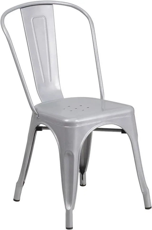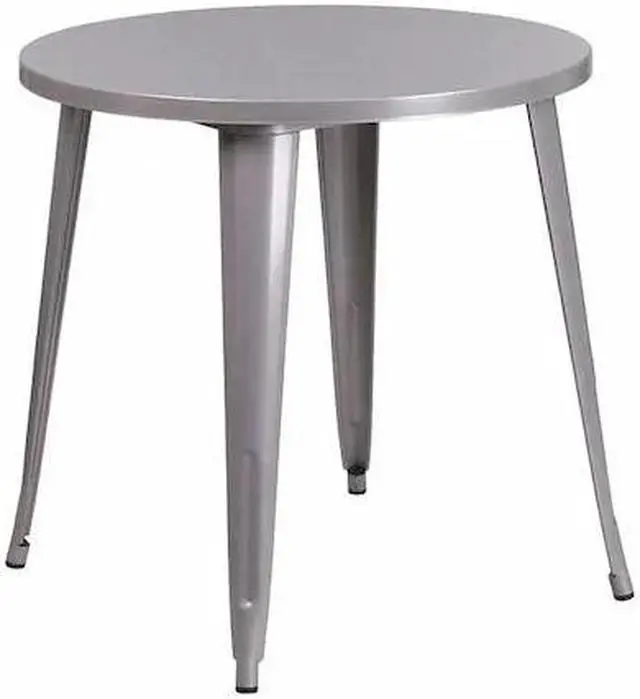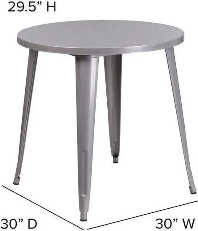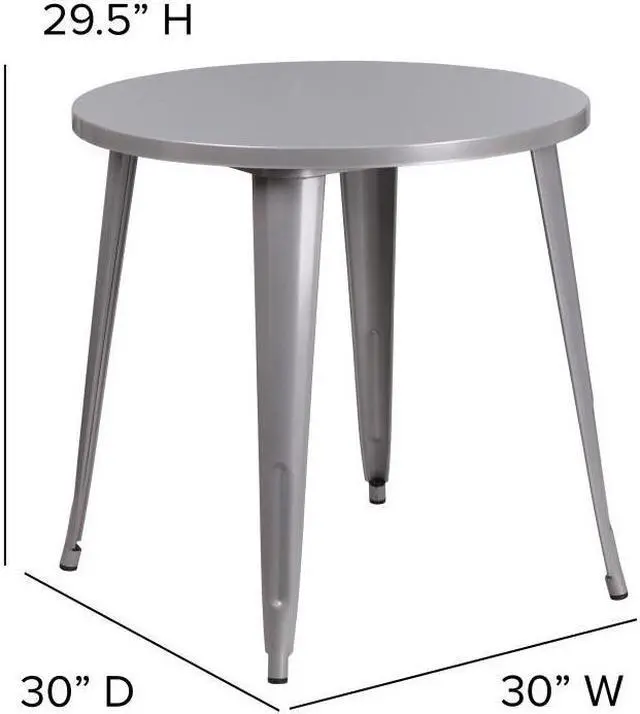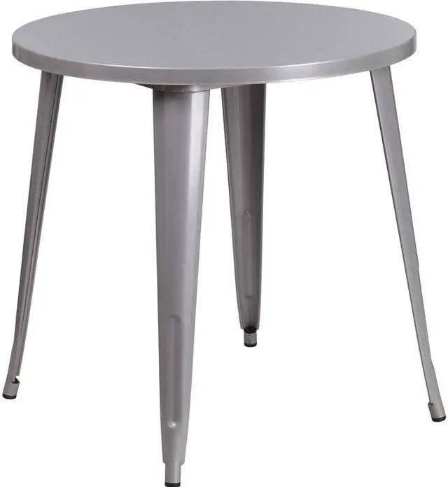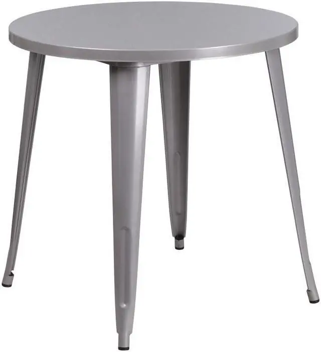 Create a vibrant, energetic dining space with this colorful industrial style silver metal table. This lively table will add a retro-modern look to your home or business. Pair this table with like colored metal chairs for a uniform look or mix things up by adding different colored chairs. A thick brace underneath the top adds extra stability. The legs have protective rubber floor glides that prevent damage to flooring. This all-weather table is great for indoor and outdoor settings. For longevity, care should be taken to protect from long periods of wet weather. Great for both commercial and residential spaces, the decorating possibilities for this table are only limited by your imagination!.