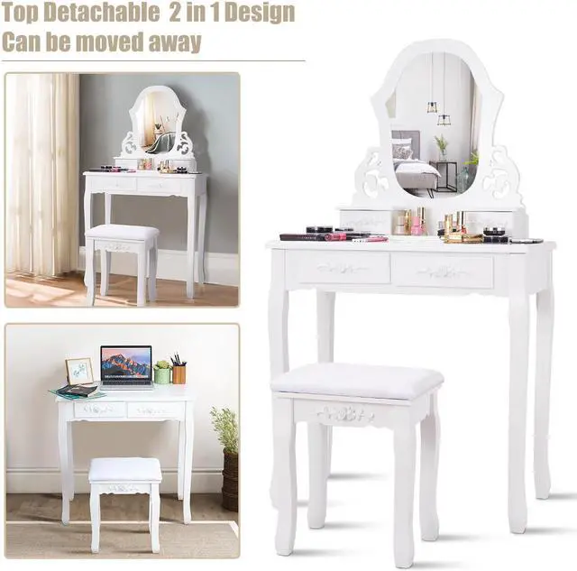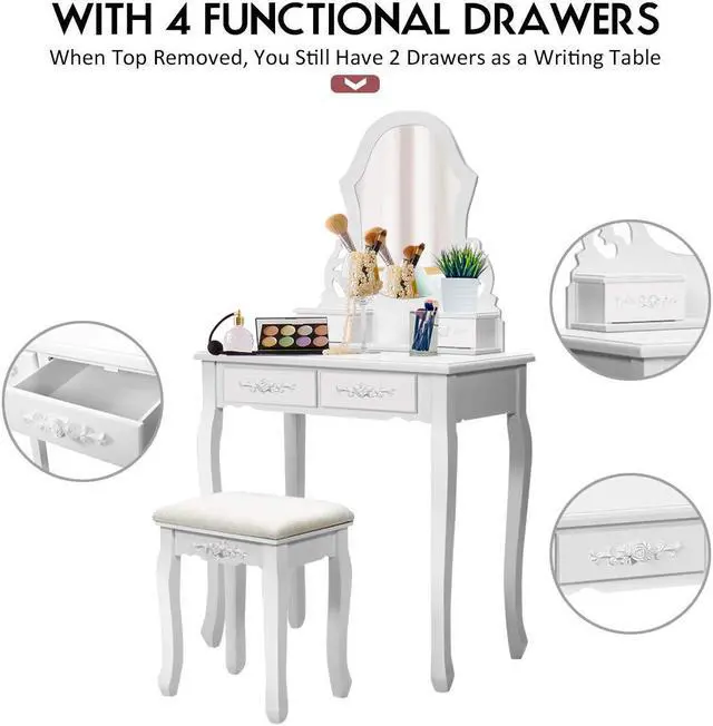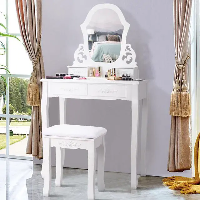 Every girl wishes to have a glamorous dressing table with all her jewelry and make up. Do nothesitate, let us come your princess dream true. This vanity table set comes with mirror, stool and 4 storage drawers. Powerful storage capacity is great for storing all your jewelry. A smooth Removable tabletop provides space for cosmetics and beauty supplies. Elegant look compares well with your furniture, perfect to use in your bedroom. Do not miss our this dressing table.