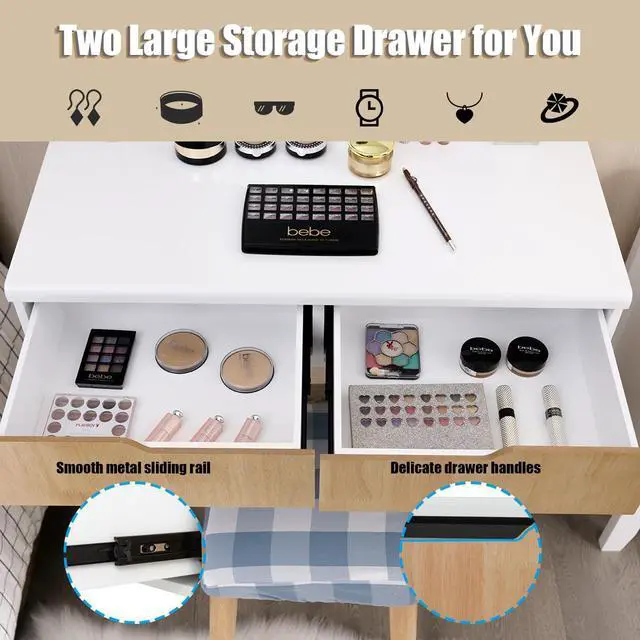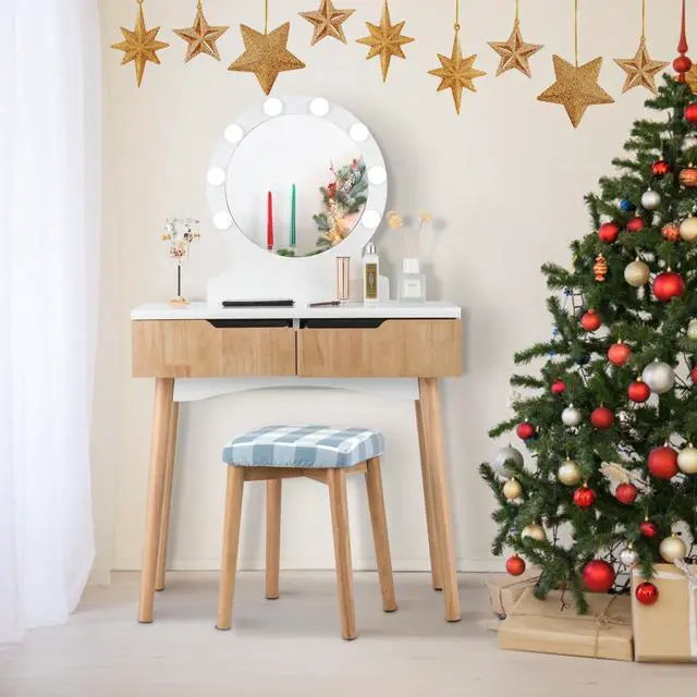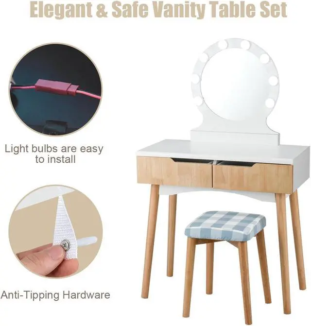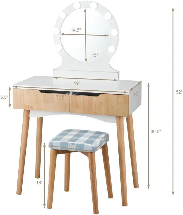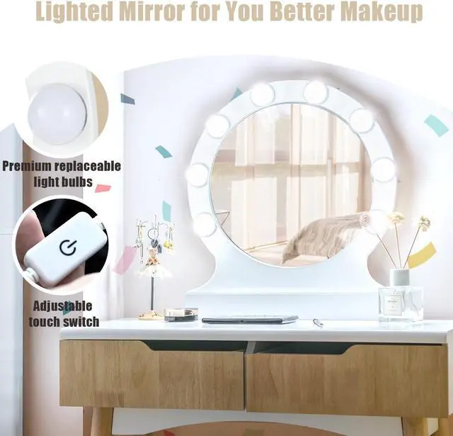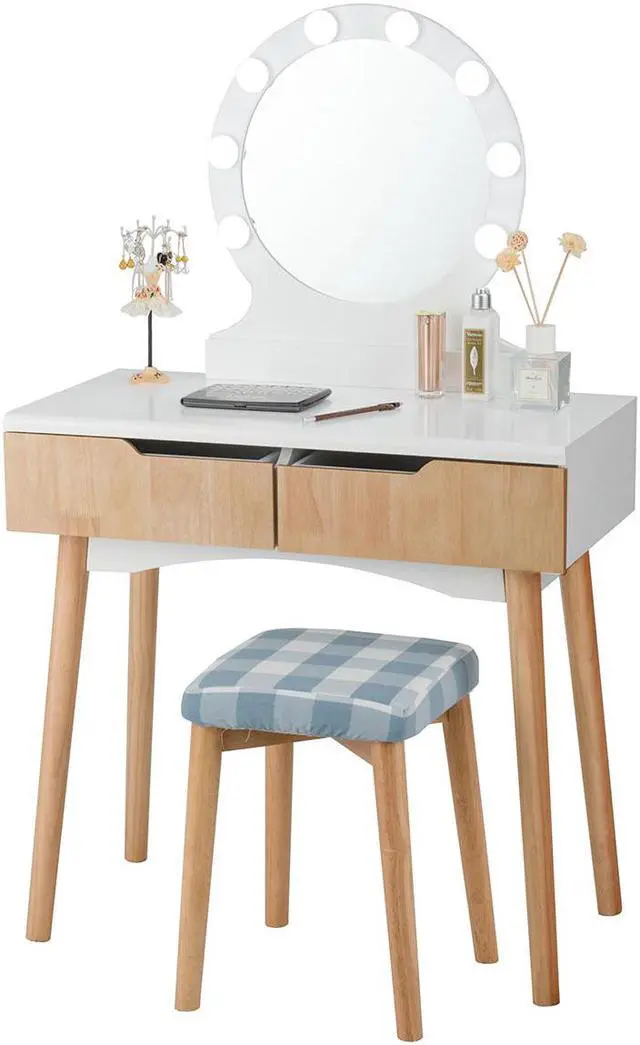 Get up in the morning and start the day with our perfect makeup.If you're looking for a unique dresser, don't miss our amazing vanity table with lights. This is our elegant and simple dressing table with round mirrors and cushioned stools. Made of high quality P2 MDF and solid wood,sturdy construction with 100% solid wood legs to ensure the enough support, resulting in a long use time. Soft cushioned stool brings great comfort and relieves fatigue during long periods of make up.The grid cushioned cover can be removed for easy clean. We provide 11 LED bright bulbs, 3 of which are spare.The power plug is UL certified for safe use. The large and high-definition mirror with 8 bulbs gives you a clear, bright makeup experience in low-light environments. Of course,the upper part of the dresser can be removed and used as a writing table. The wide desktop and 2 large drawers with smooth slide rails provide enough storage space for your daily needs. Simple design can match the decoration style of any room, ideal to be placed in small spaces. Our products are competitive and won't let you down.