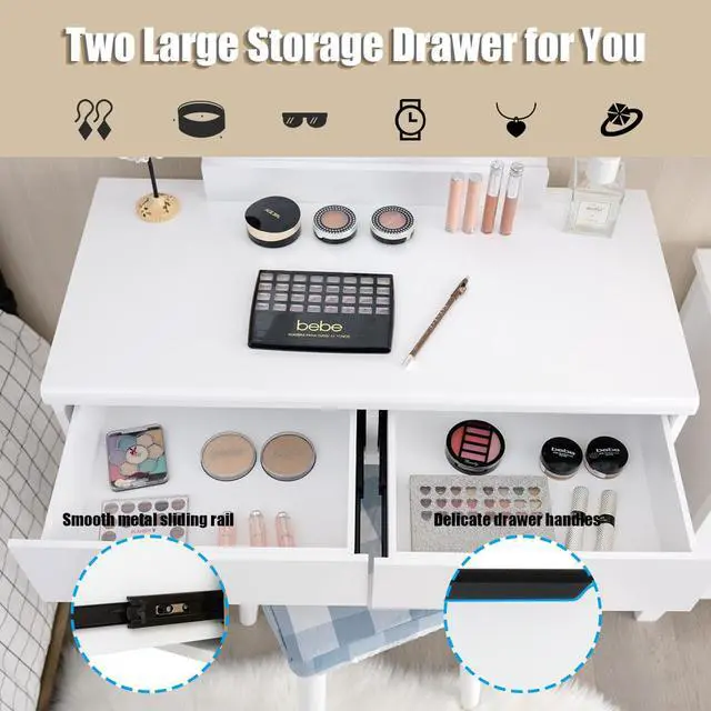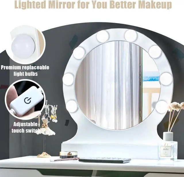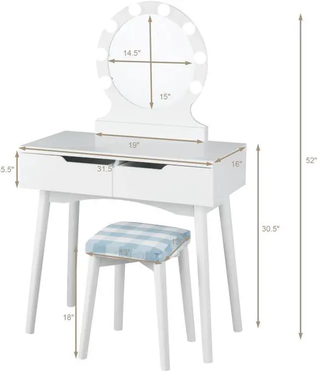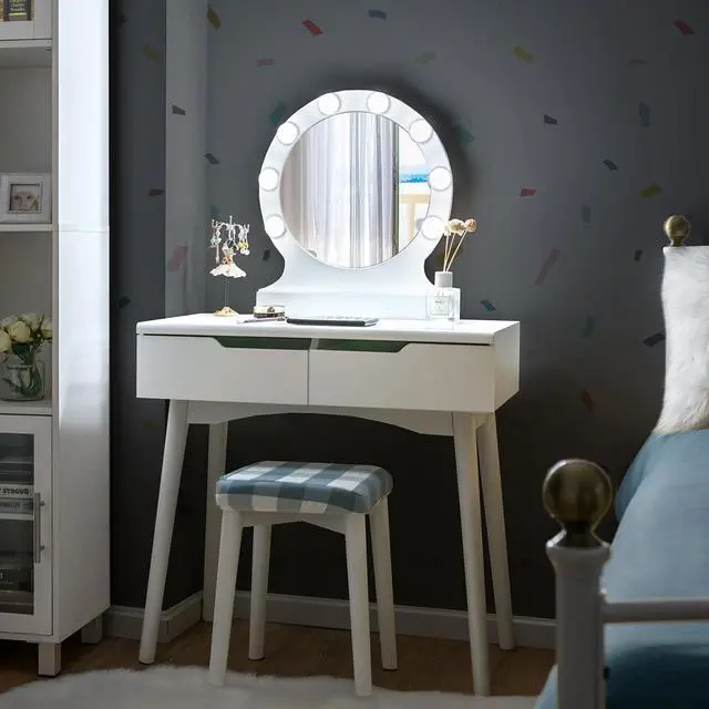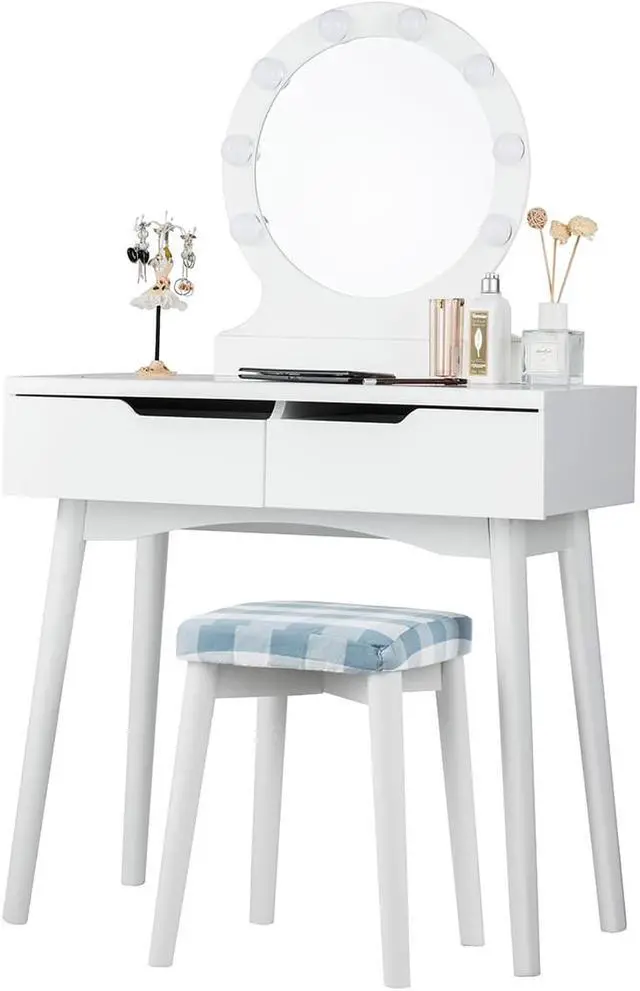 Get up in the morning and start the day with our perfect makeup.If you're looking for a unique dresser, don't miss our amazing vanity table with lights. This is our elegant and simple dressing table with round mirrors and cushioned stools. Made of high quality P2 MDF and solid wood,sturdy construction with 100% solid wood legs to ensure the enough support, resulting in a long use time. Soft cushioned stool brings great comfort and relieves fatigue during long periods of make up.The grid cushioned cover can be removed for easy cleaning. We provide 11 LED bright bulbs, 3 of which are spare.The power plug is UL certified for safe use. The large and high-definition mirror with 8 bulbs gives you a clear, bright makeup experience in low-light environments. Of course,the upper part of the dresser can be removed and used as a writing table. The wide desktop and 2 large drawers with smooth slide rails provide enough storage space for your daily needs. Simple design can match the decoration style of any room, ideal to be placed in small spaces. Our products are competitive and won't let you down.