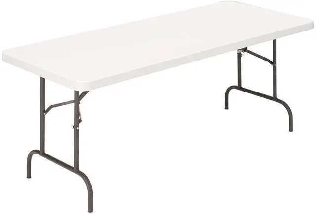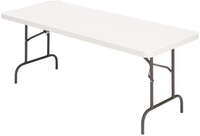Add a Realspace plastic top folding table to your home or office to create a sturdy temporary workstation or storage area. If you're done with your project, the Realspace molded plastic top folding table features legs that fold up, so you can store it until it's needed again. Steel frame. Dent-, scratch- and rust-resistant surface. Impact-resistant design folds up. Automatic gravity leg locks. Non-marring foot caps. 8' wide molded plastic top folding table is 29" tall. Stylish Realspace folding table in platinum. Tested to meet ANSI/BIFMA Performance Standards - Manufacturer testing has been conducted on this product to meet specific performance requirements and safety standards set forth by the American National Standards Institute (ANSI) and the Business and Institutional Furniture Manufacturers.