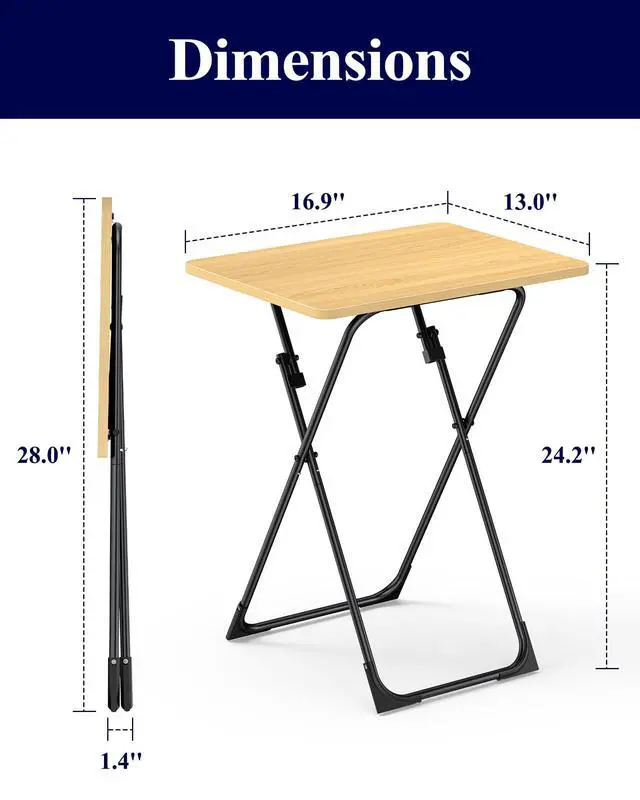 1. This compact dinner tray for eating on couch measures just 16.9" x 13.0" x 24.2", offering enough space for your laptop, books, or meals without taking up much floor space. When not in use, the TV tray for eating folds down to only 28.0"×1.4", allowing you to easily store it under the bed, behind a door, or in a closet.