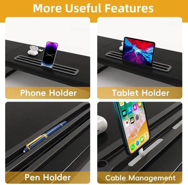 Unique slot design could hold tablet, cell phones and manage cables, pens, clips, and other office supplies.
