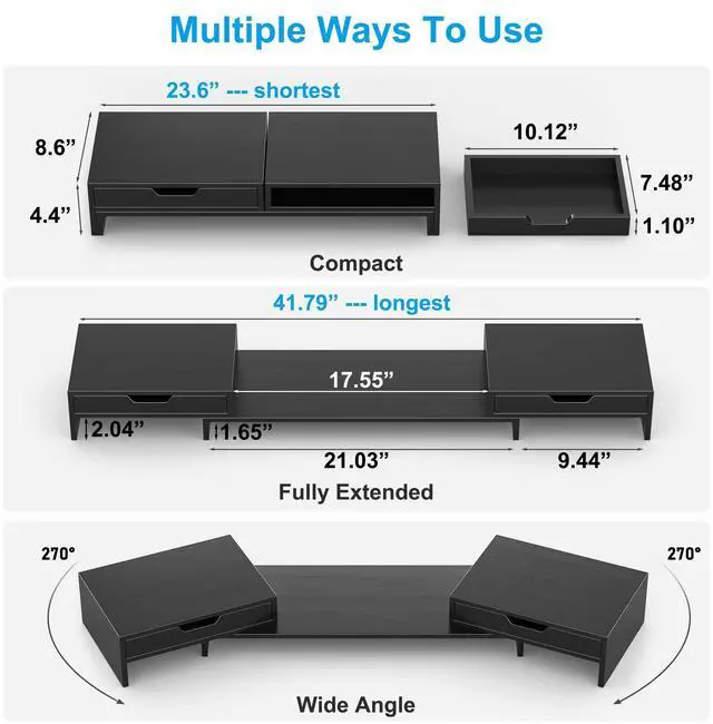 Flexible angles fit corners. Holds 2 monitors + 1 laptop, with under-riser storage.