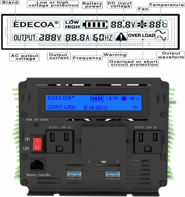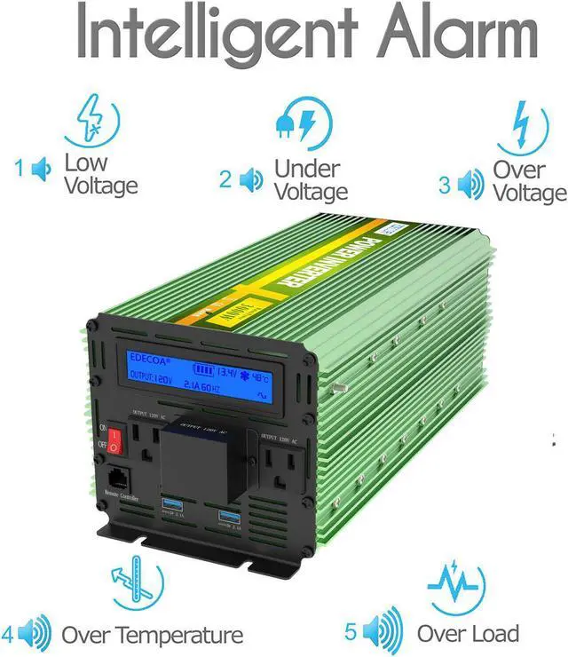 Battery protection function: battery voltage is being constantly and intelligently monitored. When DC voltage is too low, the inverter shut down automatically, which can prevent the battery and loads from being damaged. Let you have nothing to worry about when operating.