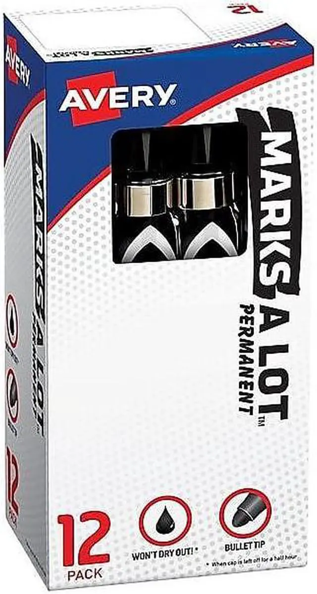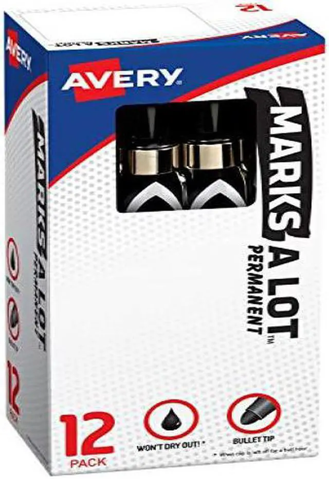 Make your mark on the world with Avery Marks-A-Lot permanent markers. These large, thick markers hold over 30% more ink than regular desk-style markers. The resilient bullet tip stays solid even with frequent use and is great for creating bold, clean writing. The versatile, permanent black ink dries quickly when used but won't dry out if you forget the cap. Leave the cap off for up to half an hour and you will still be able to pick the marker back up and keep writing. The permanent ink resists wear and water exposure and is perfect for any use. These markers work with multiple surfaces including paper, cardboard, metal, PVC, concrete, plastic and ceramic. Write on sports equipment, make signs for yard sales, mark boxes and more. Marks-A-Lot bullet tip markers are great everywhere from classrooms and offices to warehouses and manufacturing facilities. Avery Marks-A-Lot permanent markers are also low-odor and nontoxic so that they can be safe in classrooms as well as in laboratories. The ink is ACMI certified as nontoxic and conforms to ASTM D4236.