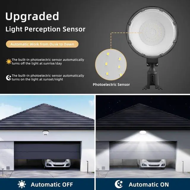 Dusk to dawn photocell and energy saving With sensitive and accurate photocells, this dusk to dawn LED barn light automatically turns on at night and turns off during the day, intelligently reducing electricity waste. What's more, our 300W outdoor security light provides 30000LM brightness, which is more efficient than other 400W 10000LM HPS/halogen bulbs, helping you save more than 80% of your electricity bills.
