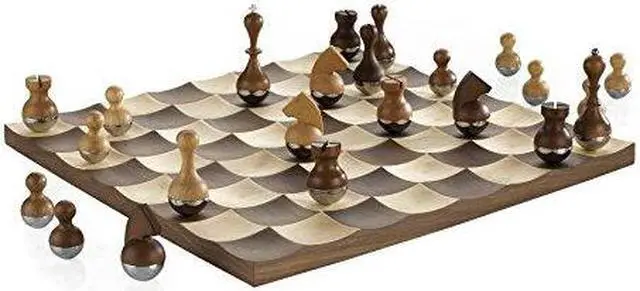 This Umbra Wobble chess set features a concave board for pieces to wobble, metal and wood chess pieces, making for lively interaction between board and game pieces. A strategic game to lend movement and energy, it brings an understated elegance to each match you play with it. Wobbling chess pieces gives motion to an otherwise still game Chess board has a concave landscape to keep the pieces on place Not only for playing but is also great as a display Perfect as a gift Made of solid walnut / maple wood