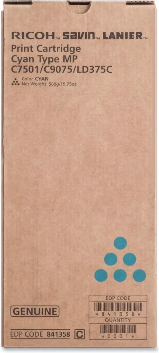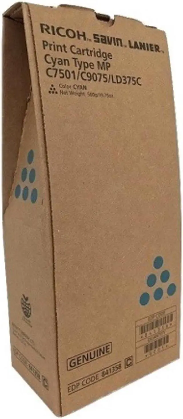 Ricoh 841358 Original Toner Cartridge - Laser - Cyan - 1 Each Toner cartridge is designed for use in Ricoh Aficio MP C6501 and C7501. Toner delivers excellent print quality and sharp images and text. Dependable cartridge is easy to install and yields approximately 21,600 pages.
