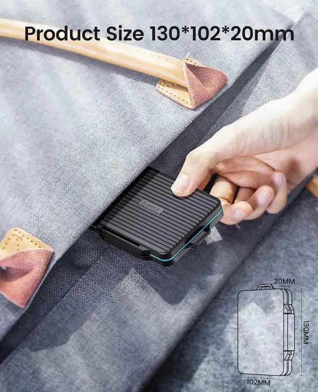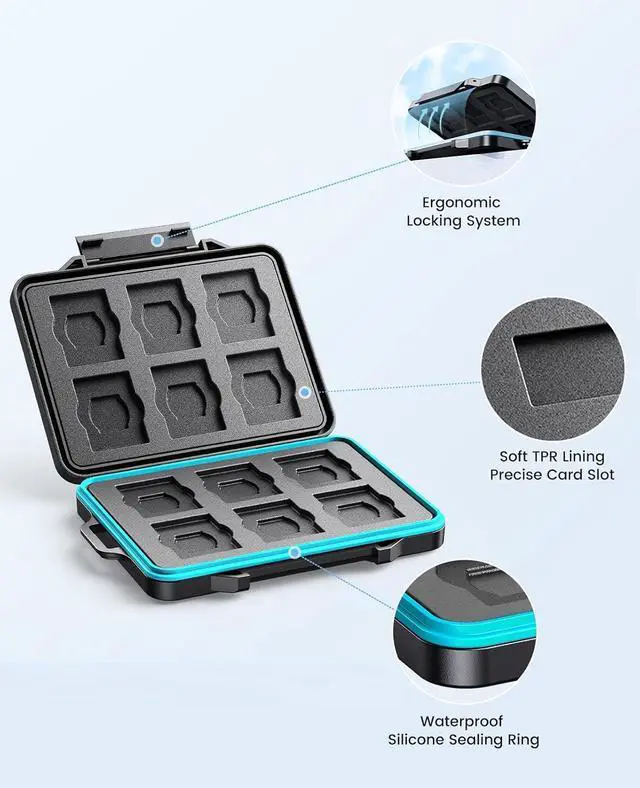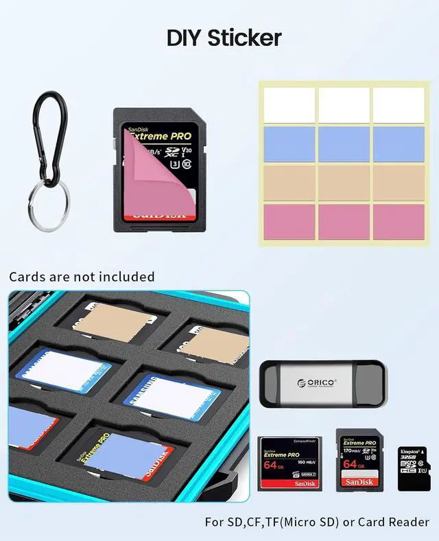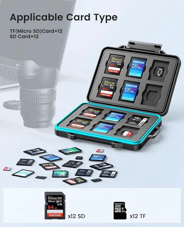 Product Weight: 84g Product Advantage Compact & Lightweight--- Easy carrying SD Card and TF Card holder by simply slipping into camera bag. Storage case with hanging hole, easy to match the mountaineering buckle. Special design ---design with 12 slot for SD card and 12 slot for Micro SD cards, small size, big capacity Good protection to your cards---Dedicate tooling, with good material and nice closure, makes it shock resistant, water-resistance (cannot immerse into the water) Durable---High quality ABS material, durable and have a long life span. Shockproof---Hard protective exterior shell for most safety of memory cards. Anti-static---Powerful Shield For Static, Anti-static EVA foam provides strong protection from static. Dustproof, Waterproof, full protection---This SD cards holder can protect your cards from destroying, missing. It can protect your cards from drip water, but cannot be used in water and in the rain. Please take care of this before purchasing. Easy one-touch open or close What's in the package? 1 X Ouer package 1 X TF (Micro SD) Card×12, SD Card×12 Storage Case 1 X Carabiner 1 X Tags 1 X After-sale service card