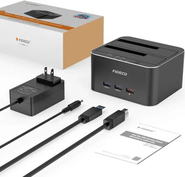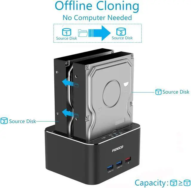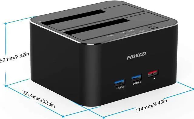 FIDECO Dual bay 4 in 1 hdd docking station offers an easy access with two 2.5 / 3.5 inches HDD SSD SATA I/II drives, which is a perfect solution for backup & processing IT data, batch processing data, formatting, Offline Cloning and file transfers etcSupport 16TB: Please note the target disk must be larger than the source disk. FIDECO hdd dock own 2 USB 3.0 ports and 1 USB 3.0 fast charge port, ensuring quick syncing and file sharing, make a superior data-storing versatility. USB 3.0 Transfer Speeds Up to 5Gbps, backwards compatible with USB 2.0 and 1.1S upport