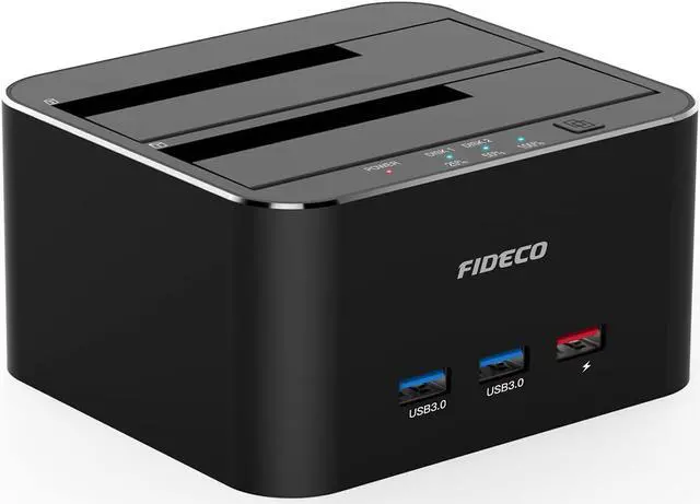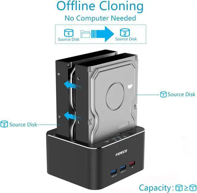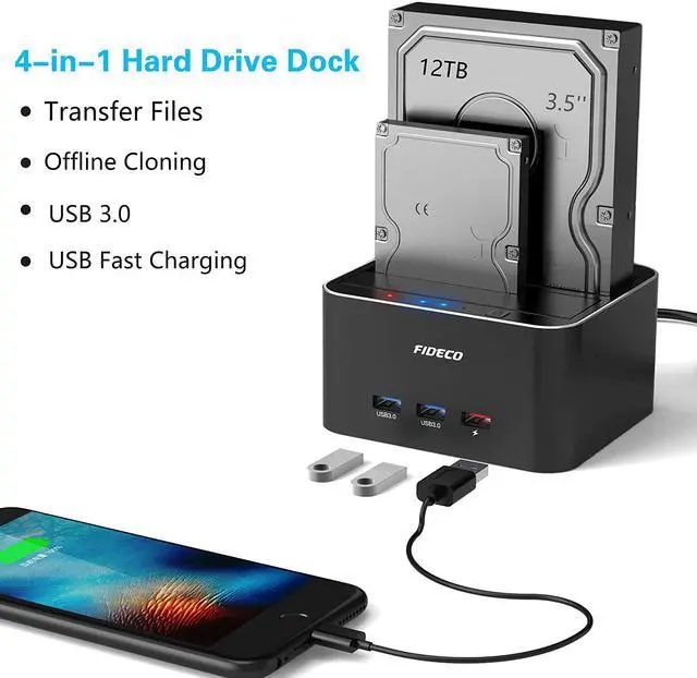 FIDECO Dual bay 4 in 1 hdd docking station offers an easy access with two 2.5 / 3.5 inches HDD SSD SATA I/II drives which is a perfect solution for backup & processing IT data batch processing data formatting Offline Cloning and file transfers etcSupport 16TB: Please note the target disk must be larger than the source disk. FIDECO hdd dock own 2 USB 3.0 ports and 1 USB 3.0 fast charge port ensuring quick syncing and file sharing make a superior data-storing versatility. USB 3.0 Transfer Speeds Up to 5Gbps backwards compatible with USB 2.0 and 1.1S upport