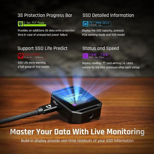 Don't let power outages or surges compromise your data. Dockcase M. 2 NVMe SSD external case offers a typical 3-second PLP, safeguarding up to 2TB of SSD data. This feature ensures that your critical information is protected, giving you peace of mind and reliable data integrity. (the actual time will be affected by the working state and power consumption of the SSD).
