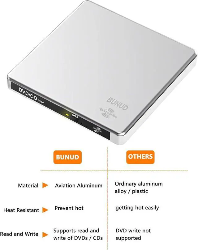 Slim Aluminum Alloy MaterialThe top cover of the external CD drive is made of aluminum alloy. It makes your drive look shiny. The combination of silver aluminum alloy cover and white bottom case allows you to see the DVD drive on the desktop immediately. It can become a beautiful landscape in your room