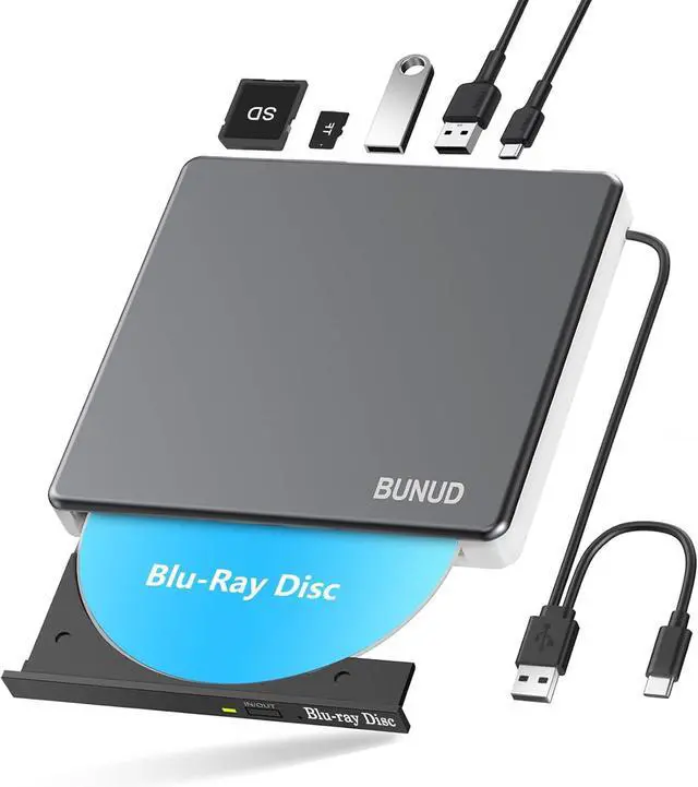 5 in 1 external DVD Drive BUNUD external CD DVD drive features independent SD/TF card slot, 2 USB ports and Micro USB ports. It can transfer photos and videos from SD/TF card to computer, USB disk and flash drive directly. The DVD drive has 2 extra USB ports, which can be used to connect the U disk and charge your phone or other electronic devices