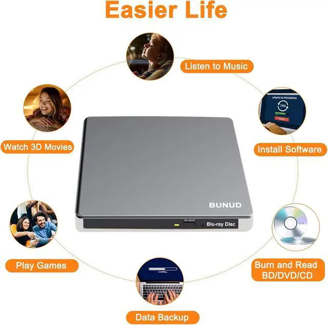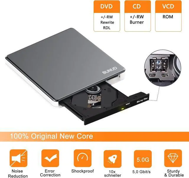 Slim Aluminum Alloy MaterialThe top cover of the external CD drive is made of aluminum alloy. It makes your drive look shiny. The combination of silver aluminum alloy cover and white bottom case allows you to see the DVD drive on the desktop immediately. It can become a beautiful landscape in your room