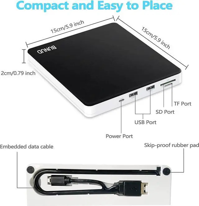 5 in 1 CD DriveExternal DVD drive has an independent SD/TF card slot, 2 USB ports and micro USB ports. It can transfer photos, videos or musics directly from SD/TF card into the computer/laptop