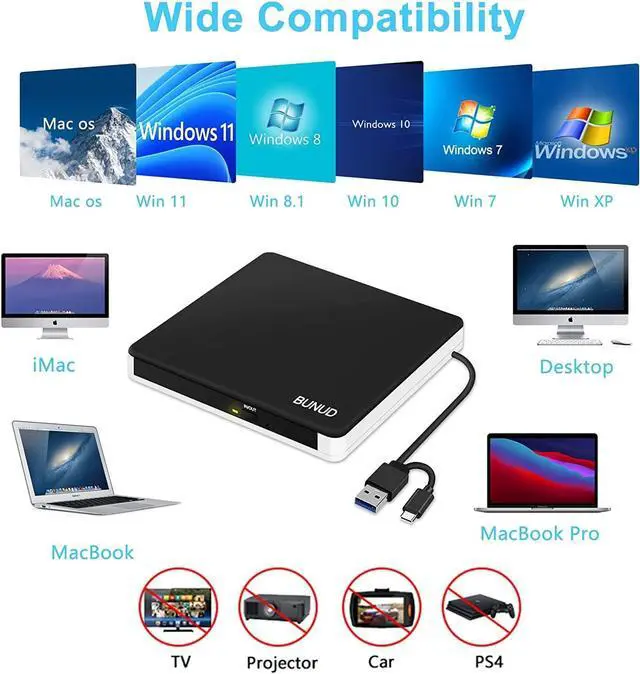 Wide CompatibilityCD rom external drive is compatible with Windows 11/ 10/ 8.1/ 7/ XP, Linux and all versions of Mac OS. You can use external CD drive on almost all computers such as MacBook Pro/Air, iMac, Mac Mini, Laptop, and Desktop, PC