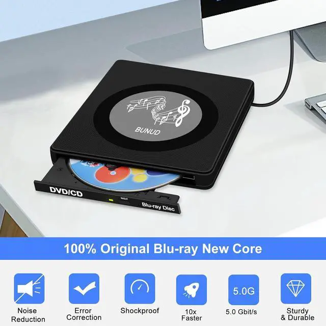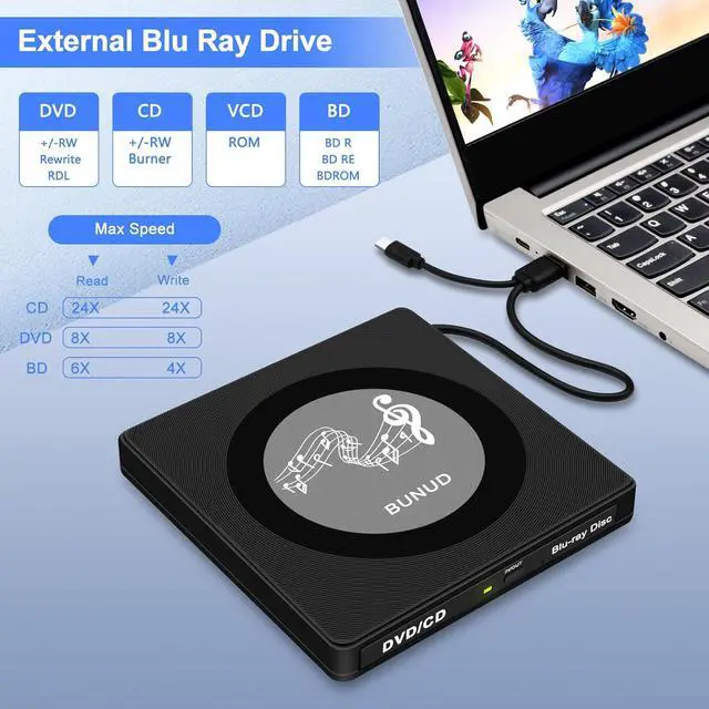 Multi-Functional Blu-Ray DriveThe portable blu ray CD/DVD Drive for laptop is multi-functional that users can use to play music, watch movies, backup data, install programs, and transfer files. And USB 3.0 & Type C interface has strong error correction capability, impact resistance, low noise, and low power consumption.