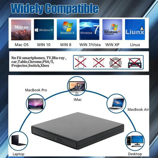 1. External Disk Driver cannot support to used with TVs, cars, smartphones, Blu-ray DVDs,projector ,tablet , smartphone ,ChromeBook ,PS4/5,Switch ,Xbox.